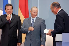 Канцлер ФРГ Герхард Шредер (слева) и Президент России Владимир Путин (справа) перед началом трехсторонних переговоров между президентами России, Франции, Германии. Переговоры состоялись в резиденции Президента России "Бочаров ручей".
