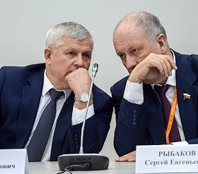 Рабочая поездка президента России Владимира Путина в Коломну. Встреча президента России с участниками Форума малых городов и исторических поселений. Член комитета Государственной думы России по аграрным вопросам, президент Общероссийского конгресса муниципальных образований Виктор Кидяев (слева) и представитель от законодательного (представительного) органа государственной власти Владимирской области, председатель правления ассоциации "Русская провинция" Сергей Рыбаков (справа) перед началом встречи.