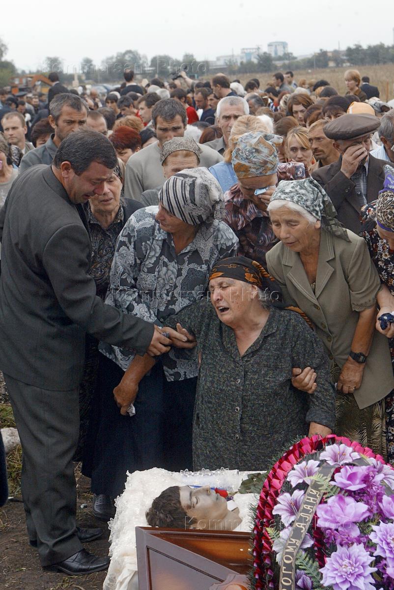 Похороны погибших заложников при теракте в городской школе № 1 города Беслан. После торжественной линейки, посвященной началу нового учебного года отряд боевиков в масках в количестве 20 человек захватили учителей, учеников их родителей. Число жертв трагедии возросло до 338 человек. Более 400 пострадавших остаются в больницах. Около 200 числятся пропавшими без вести.