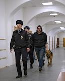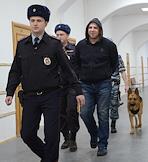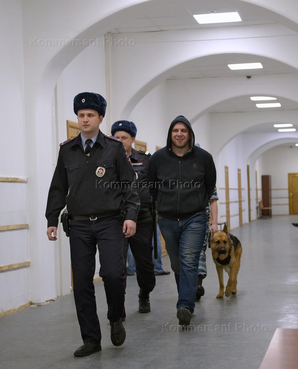 Соучастник убийства политика Бориса Немцова Темирлан Эскерханов (в центре), обвиняемый в неуважении к суду, перед началом заседания в Басманном суде.