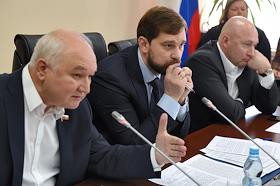 Заседание Комитета Государственной Думы (ГД) России по делам национальностей "Об итогах реализации Государственной программы Российской Федерации "Реализация государственной национальной политики" в 2017 году" прошло в ГД России. В центре, слева направо: председатель комитета ГД по делам национальностей Ильдар Гильмутдинов, глава Федерального агентства по делам национальностей России Игорь Баринов и первый заместитель председателя Комитета ГД по делам национальностей Михаил Старшинов во время заседания.