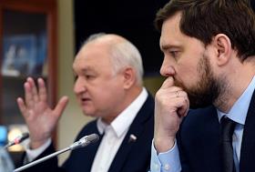 Заседание Комитета Государственной Думы (ГД) России по делам национальностей "Об итогах реализации Государственной программы Российской Федерации "Реализация государственной национальной политики" в 2017 году" прошло в ГД России. Председатель комитета ГД по делам национальностей Ильдар Гильмутдинов (слева) и глава Федерального агентства по делам национальностей России Игорь Баринов (справа) во время заседания.