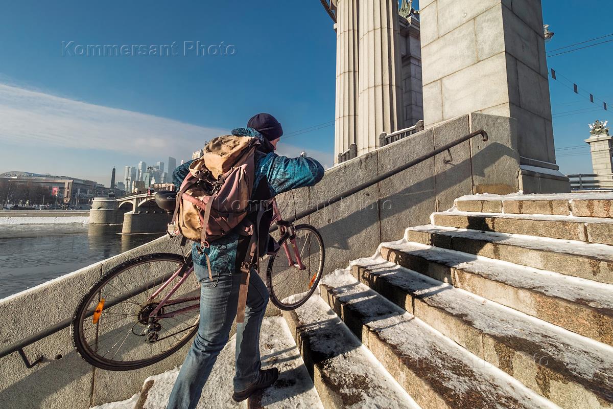 Виды Москвы. Мужчина с велосипедом поднимается по лестнице Бородинского моста.