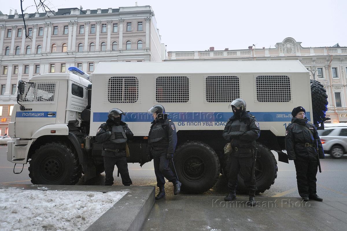 Несанкционированная акция сторонников Алексея Навального в рамках объявленной политиком "забастовки избирателей" прошла на Тверской улице. Сотрудники ОМОН рядом с автозаком.