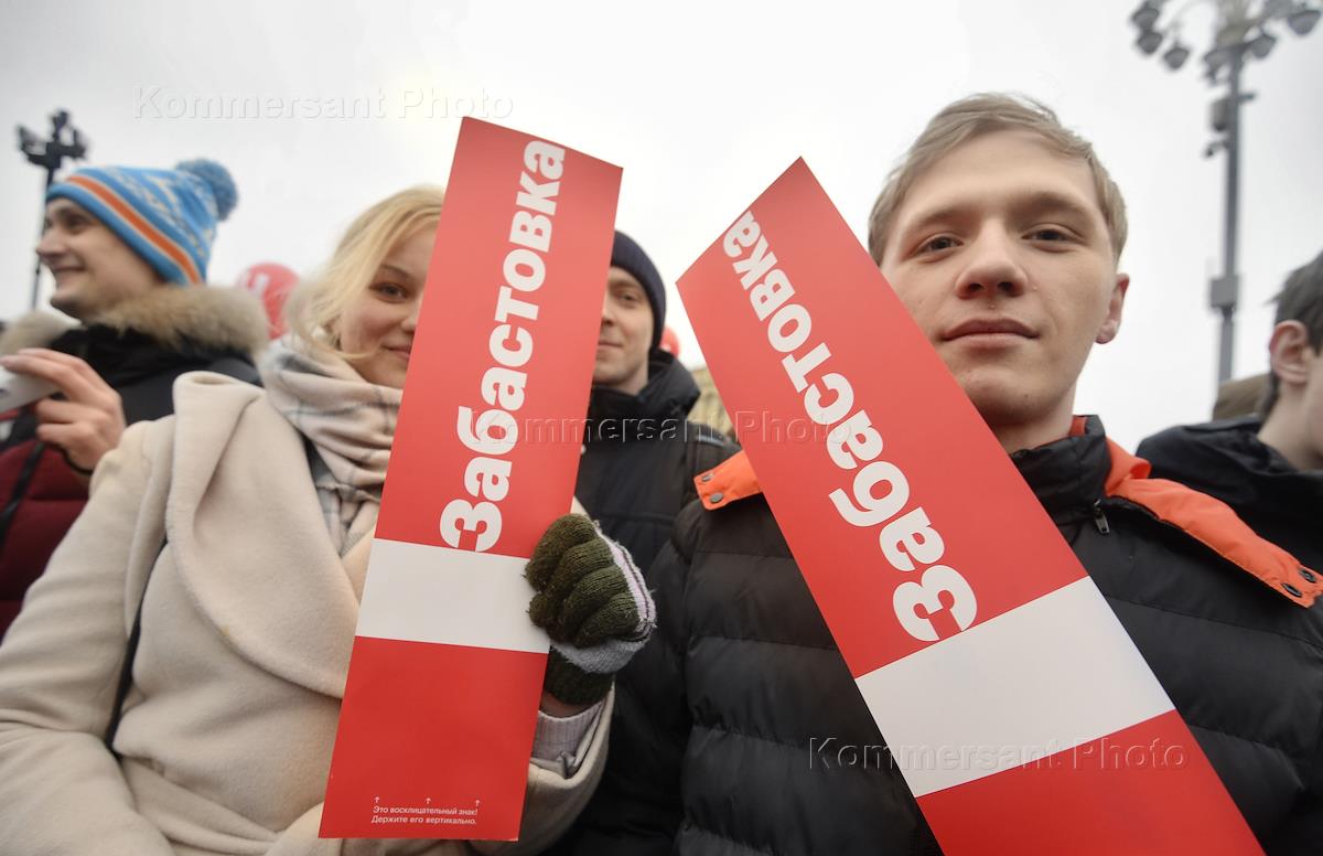 Акция сторонников Алексея Навального в рамках объявленной политиком "забастовки избирателей" прошла на Пушкинской площади. Участники с плакатом "забастовка" во время акции.