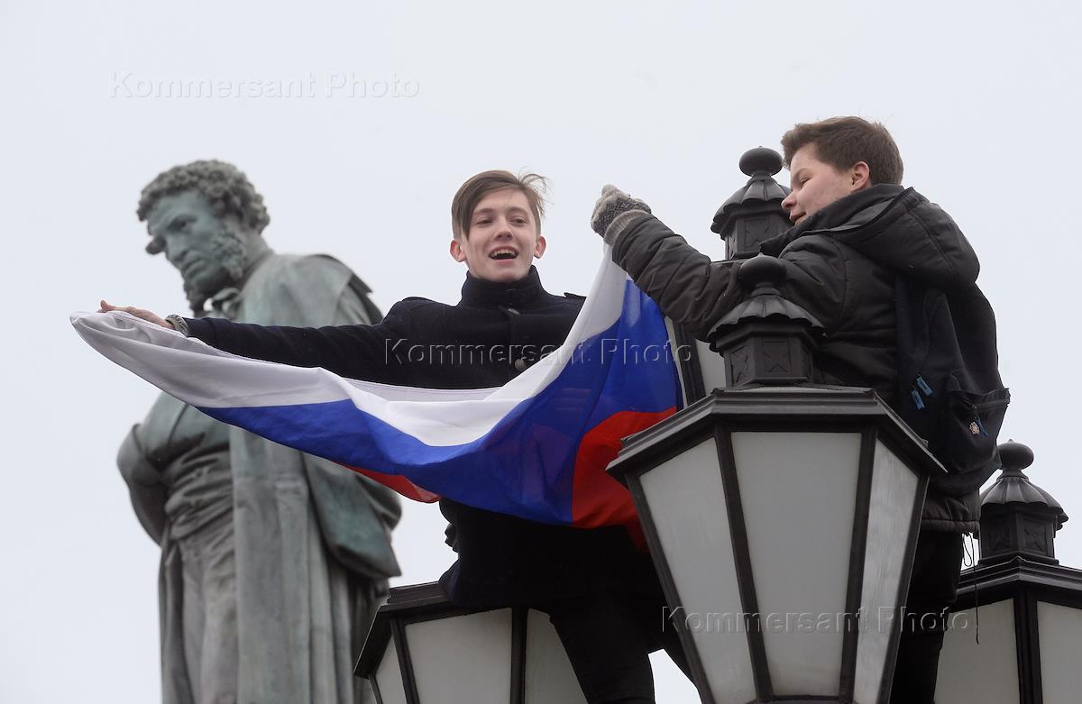 Акция сторонников Алексея Навального в рамках объявленной политиком "забастовки избирателей" прошла на Пушкинской площади.Участники на фонарном столбе с флагом России во время акции.