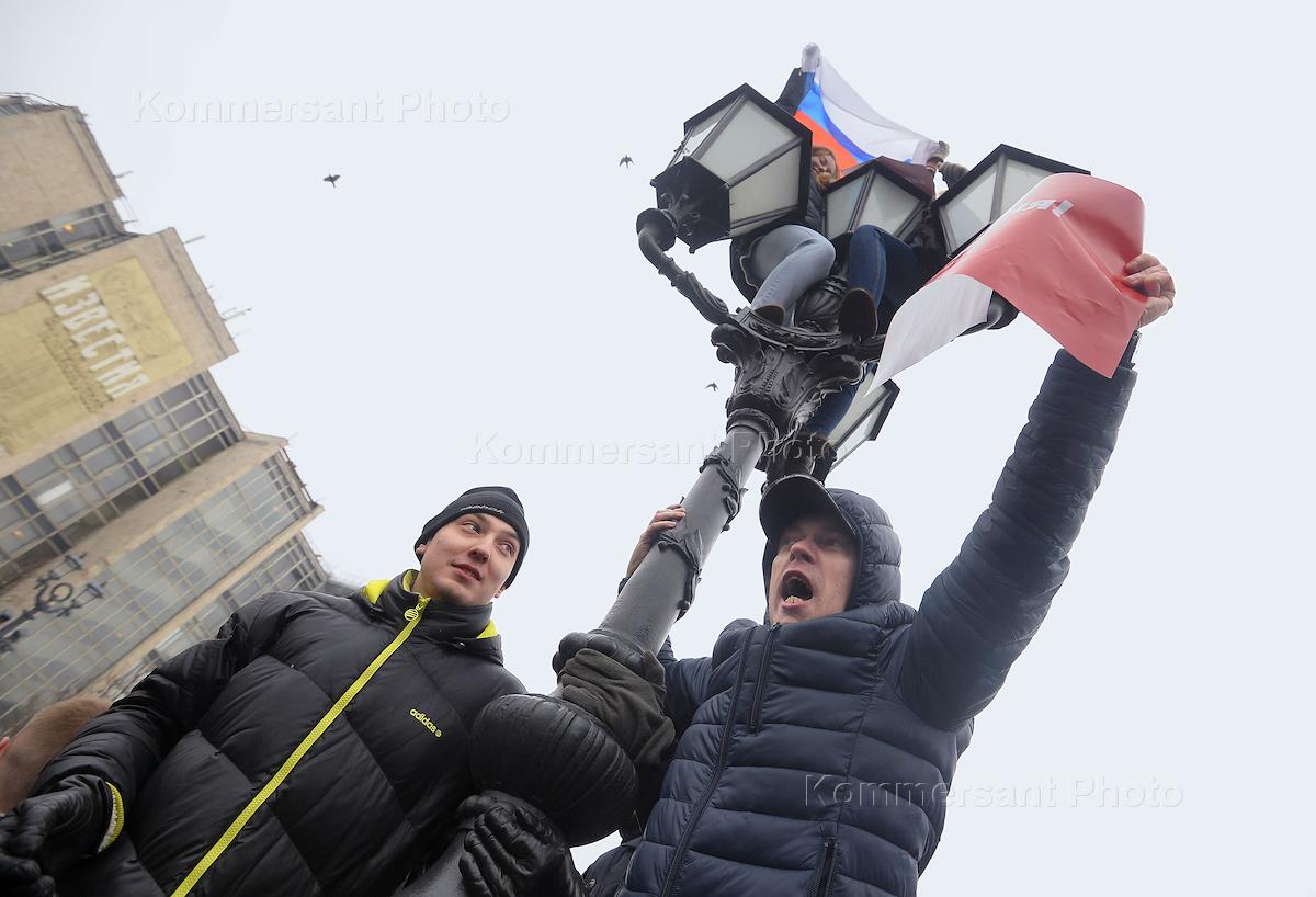 Акция сторонников Алексея Навального в рамках объявленной политиком "забастовки избирателей" прошла на Пушкинской площади.Участники на фонарном столбе с флагом России во время акции.