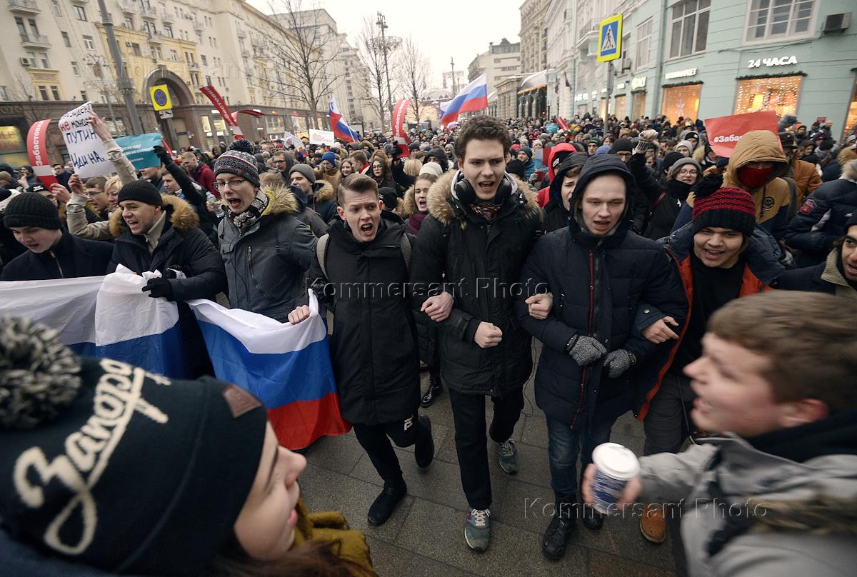 Акция сторонников Алексея Навального в рамках объявленной политиком "забастовки избирателей" прошла на Тверской улице. Участники во время акции.