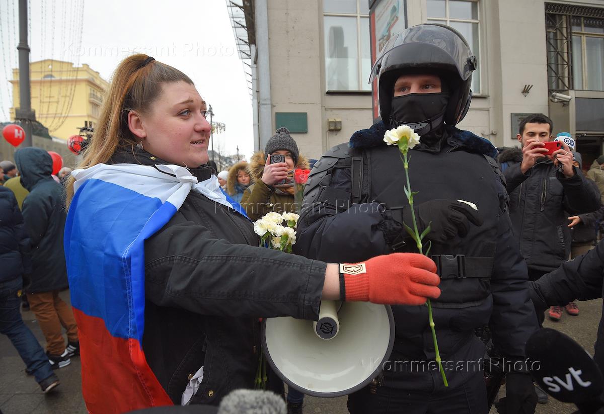 Несанкционированная акция сторонников Алексея Навального в рамках объявленной политиком "забастовки избирателей" прошла на Тверской улице. Участники с герберами в руках и сотрудники полиции во время акции.