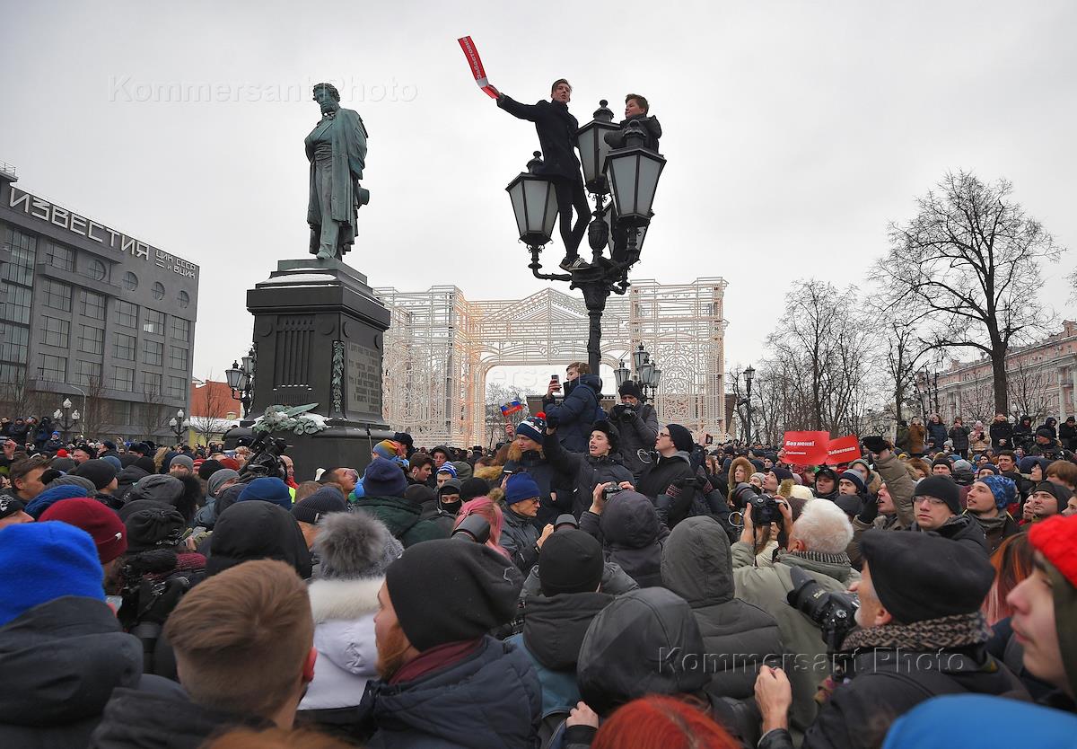 Несанкционированная акция сторонников Алексея Навального в рамках объявленной политиком "забастовки избирателей" прошла на Пушкинской площади. Участники во время акции.