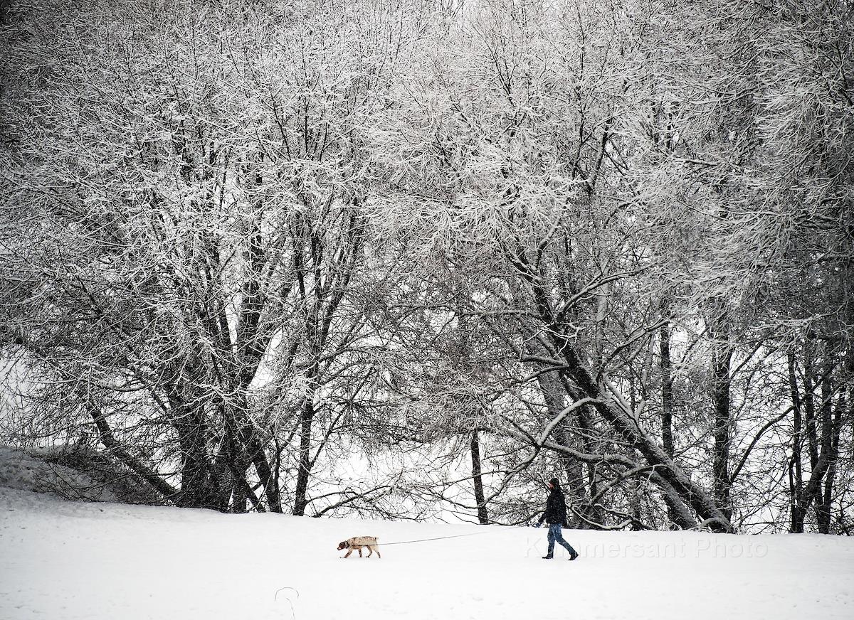 Жанровая фотография. Мужчина во время прогулки с собакой в заснеженном парке.
