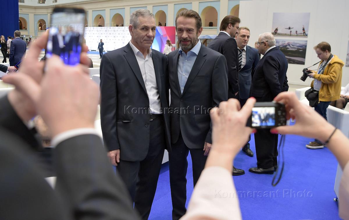 Встреча кандидата на выборах президента России 2018 года, действующего президента России Владимира Путина с доверенными лицами в Гостином дворе. Главный редактор журнала "Большой спорт" Алексей Немов (слева) и президент Всероссийской Федерации художественной гимнастики, главный тренер сборной команды России Ирина Винер-Усманова (справа) во время встречи.