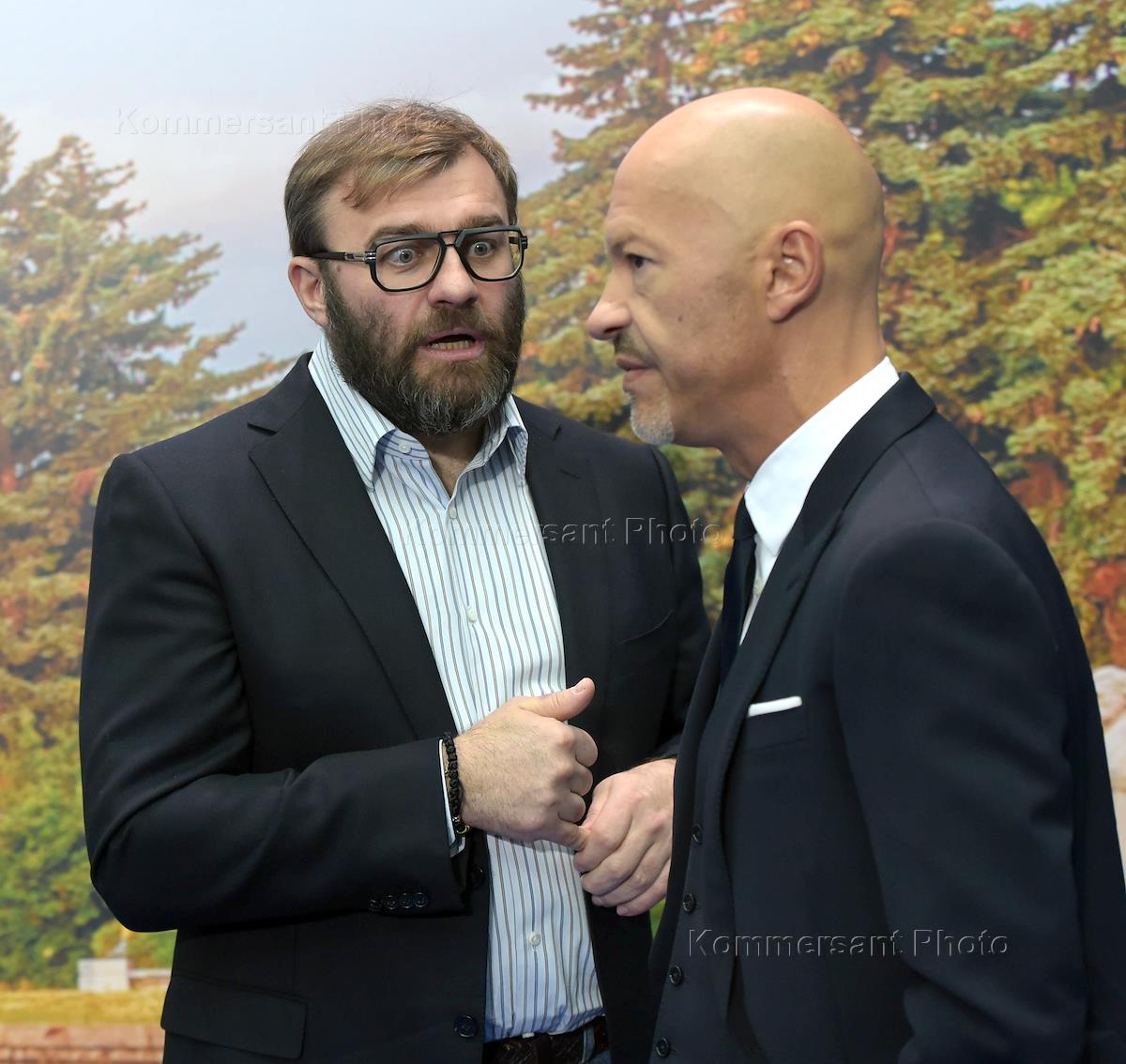 Встреча кандидата на выборах президента России 2018 года, действующего президента России Владимира Путина с доверенными лицами в Гостином дворе. Постановщик шоу по фигурному катанию Илья Авербух (слева) и председатель наблюдательного совета компании Bosco di Ciliegi Михаил Куснирович (в центре) во время встречи.