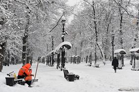 Жанровая фотография. Снегопад в Москве. Сотрудник коммунальных служб во время перерыва в работе.