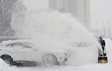 Жанровая фотография. Снегопад в Москве. Мужчина чистит снег с помощью ручной снегоуборочной машины во дворе дома.
