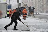 Жанровая фотография. Снегопад в Москве. Сотрудники коммунальной службы во время уборки снега на Тверской улице.