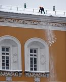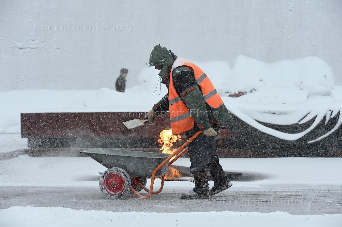Жанровая фотография. Снегопад в Москве. Сотрудник коммунальной службы убирает снег и сыплет реагенты на территории у Вечного огня на могиле "Неизвестного солдата" в Александровском саду.