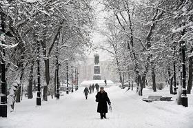 Жанровая фотография. Снегопад в Москве. Люди идут по заснеженному Гоголевскому бульвару.