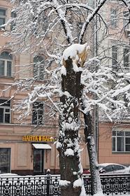 Виды Москвы во время снегопада. Фрагмент памятника писателю Михаилу Шолохову на Гоголевском бульваре.
