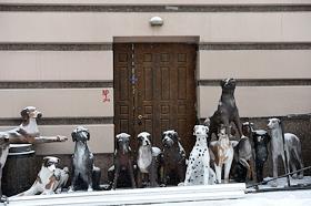 Жанровая фотография. Скульптуры собак перед входом в здание.