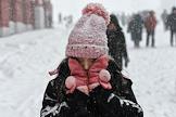 Жанровая фотография. Снегопад в Москве. Азиатская девочка во время прогулки по Красной площади в снежную метель.