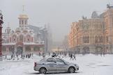 Жанровая фотография. Снегопад в Москве. Патрульный автомобиль полиции во время дежурства на Красной площади.