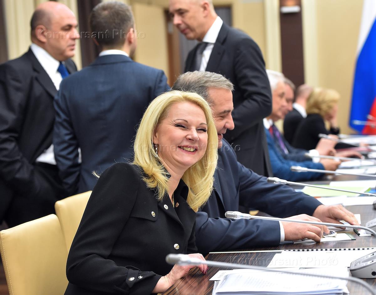 Совещание президента России Владимир Путин с членами правительства Росии прошло в резиденции Нового-Огарево. Министр здравоохранения России Вероника Скворцова (вторая справа) перед началом совещания.