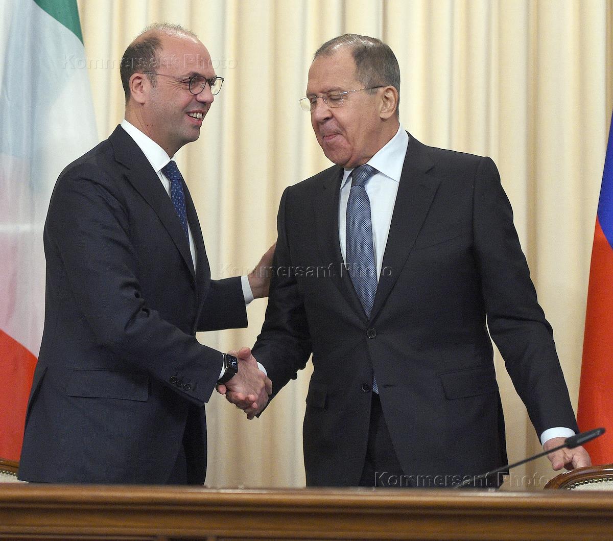 Министр иностранных дел России Сергей Лавров (справа) и министр иностранных дел Италии Анджелино Альфано (слева) во время встречи в Доме приемов МИД России.