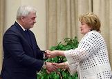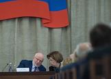 Специальное заседание Совета при президенте России по правам человека (СПЧ ) по теме "Роль гражданского общества в развитии донорства". Председатель Совета при президенте России по развитию гражданского общества и правам человека Михаил Федотов (слева) и советник Президента России Александра Левицкая (справа) во время заседания.