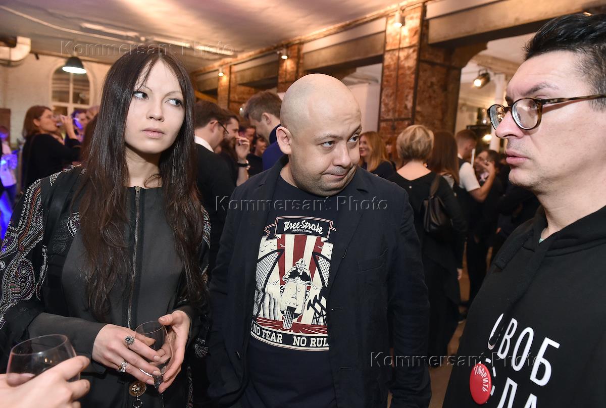 Празднование 5-летнего юбилея "Гоголь-центра". Слева направо: актер, режиссер Дмитрий Брусникин, актриса Паулина Андреева и актер, режиссер Федор Бондарчук во время празднования.