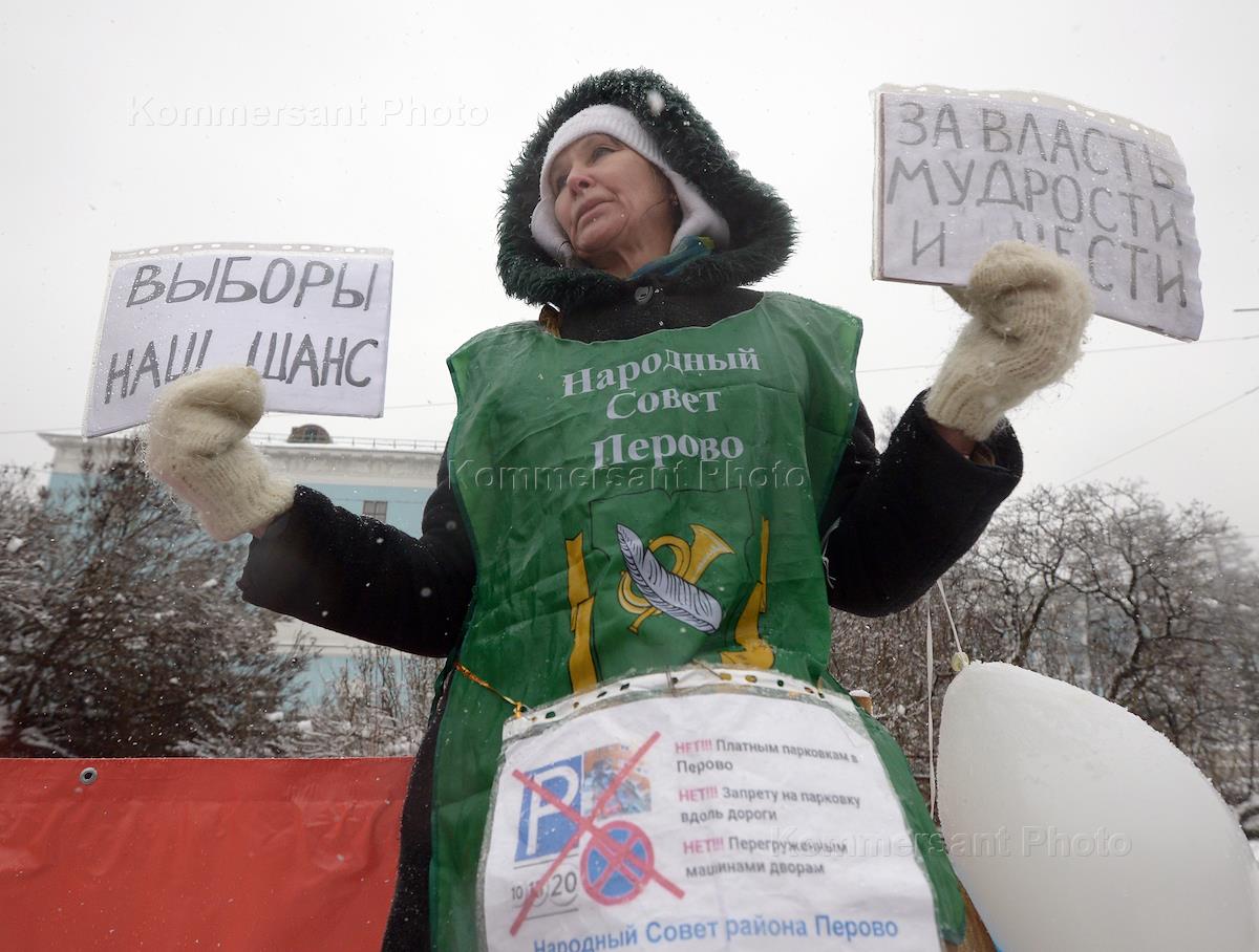 Митинг в рамках Всероссийской акции протеста "За социальную справедливость!" прошел на Суворовской площади. Участница, представляющая Народный совет Перово, во время митинга.