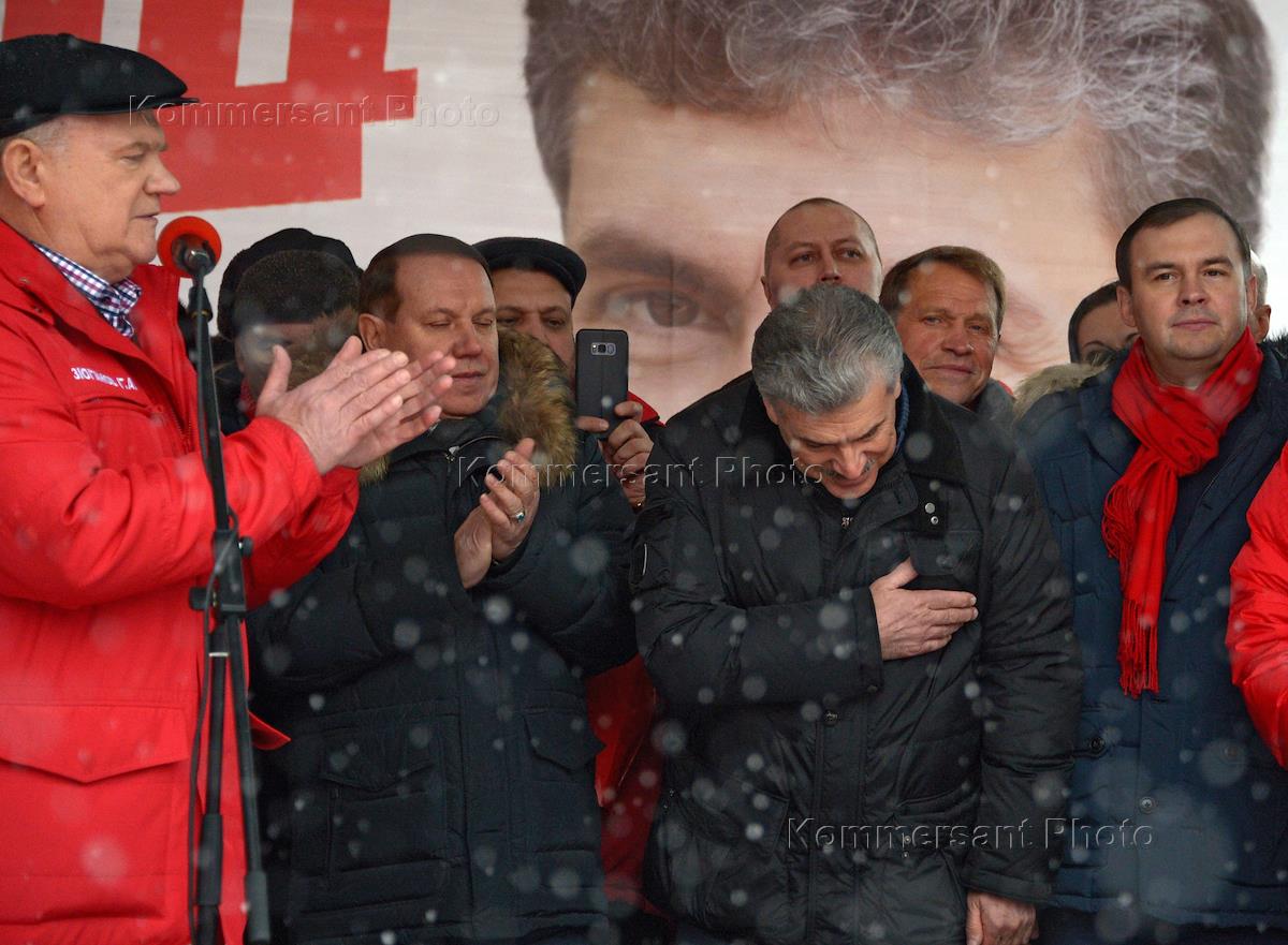Митинг в рамках Всероссийской акции протеста "За социальную справедливость!" прошел на Суворовской площади. Справа налево: лидер КПРФ Геннадий Зюганов, координатор движения "Левый фронт" Сергей Удальцов и заместитель председателя ЦК КПРФ, первый секретарь Московского городского комитета КПРФ Валерий Рашкин во время митинга.