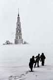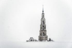 Снегопад в Тверской области. Город Калязин. Колокольня Никольского собора на Угличском водохранилище.