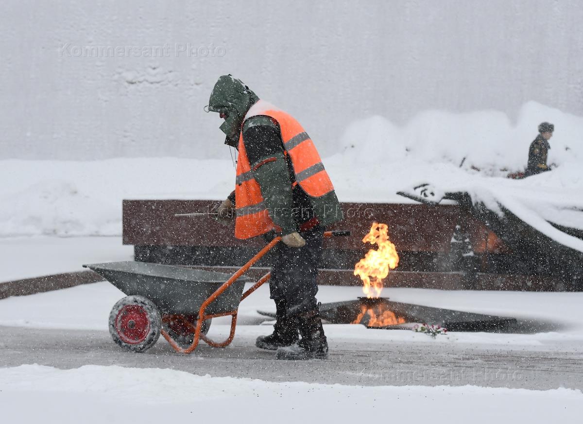 Виды Москвы. Последствия рекордного снегопада. Дворник во время уборки снега у мемориала "Могила Неизвестного солдата" в Александровском саду.
