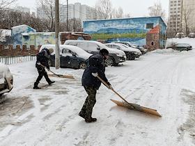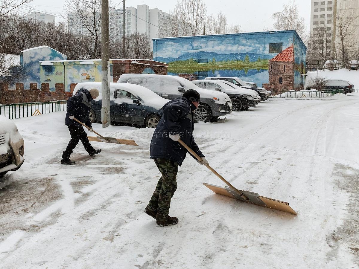 Жанровая фотография. Снегопад в Москве. Сотрудники коммунальной службы во время уборки снега во дворе жилого дома.