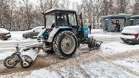 Жанровая фотография. Снегопад в Москве. Сотрудник коммунальной службы на тракторе во время уборки снега во дворе жилого дома.