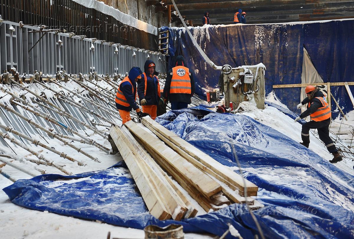 Осмотр мэром Москвы Сергеем Собяниным строительства станции метро "Юго-Восточная" Кожуховской линии московского метрополитена, которую планируют открыть в 2019 году в составе участка "Авиамоторная" - "Некрасовка". Рабочие во время отдыха в бытовке.