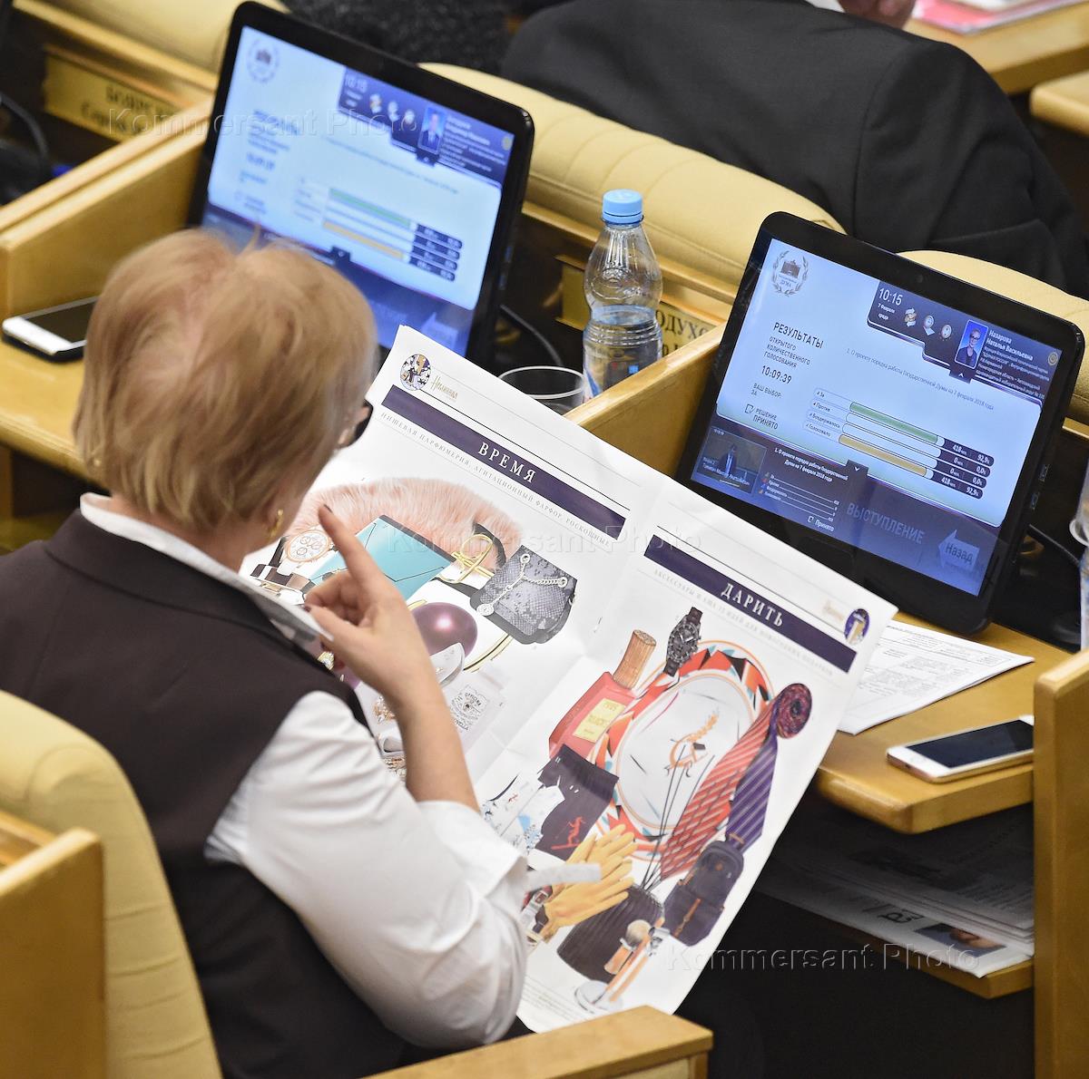 Пленарное заседание Государственной думы (ГД) России. Председатель комитета ГД по вопросам семьи, женщин и детей Тамара Плетнева во время заседания.