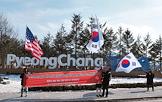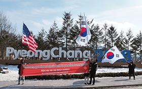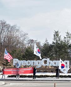 XXIII Зимние Олимпийские игры в Пхенчхане. Участники акции протеста против участия КНДР в Олимпиаде возле Олимпийского стадиона перед началом церемонии открытия.