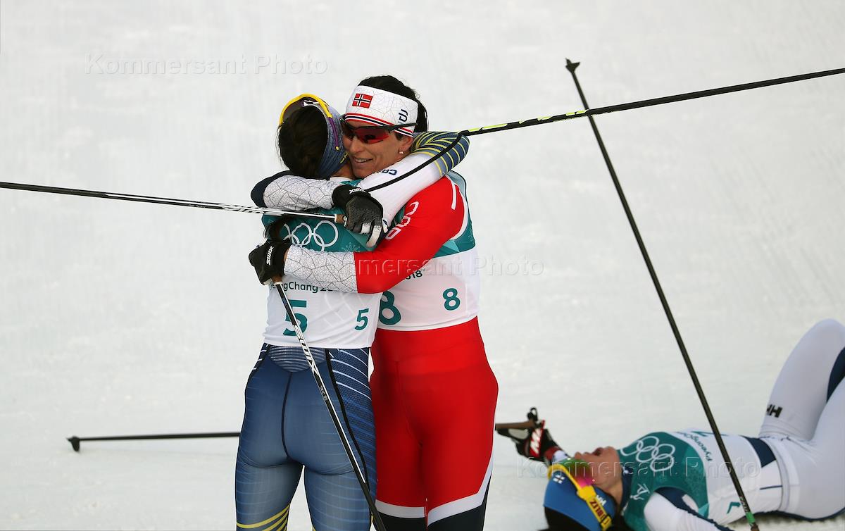 XXIII Зимние Олимпийские игры в Пхенчхане. Женщины. Скиатлон. Лыжные гонки 15 км прошли в Лыжном центре "Альпензия". Член сборной команды Норвегии Марит Бьёрген (справа) и член сборной команды Финляндии Криста Пярмякоски (слева) после финиша.
