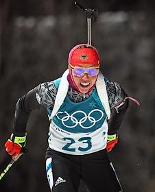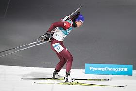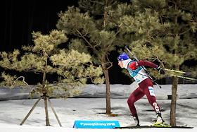 XXIII Зимние Олимпийские игры в Пхенчхане. Биатлон. Женщины. Спринт 7,5 км. Соревнования прошли в Центре биатлона Альпензия. Член сборной Франции на огевом рубеже гонки.