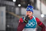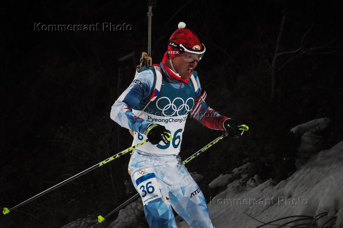 XXIII Зимние Олимпийские игры в Пхенчхане. Спринтерская гонка по биатлону среди мужчин. Участник олимпийской команды из России Матвей Елисеев во время соревнования.