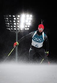 XXIII Зимние Олимпийские игры в Пхенчхане. Спринтерская гонка по биатлону среди мужчин. Спортсмен Бенедикт Долль (Германия) во время соревнования.