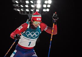 XXIII Зимние Олимпийские игры в Пхенчхане. Спринтерская гонка по биатлону среди мужчин. Спортсмен Тимофей Лапшин (Южная Корея) во время соревнования.