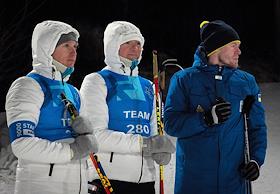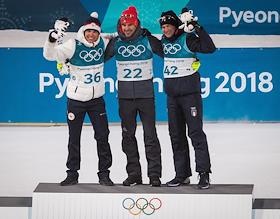 XXIII Зимние Олимпийские игры в Пхенчхане. Спринтерская гонка по биатлону среди мужчин. Слева направо: Михал Крчмар (Чехия), Арнд Пайффер (Германия) и Доминик Виндиш (Италия) во время церемонии награждения победителей соревнования.