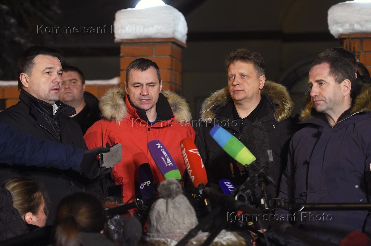 Крушение пассажирского самолета Ан-148 "Саратовских авиалиний" в Раменском районе. Слева направо: губернатор Московской области Андрей Воробьев, заместитель министра России по делам гражданской обороны, чрезвычайным ситуациям и ликвидации последствий стихийных бедствий Владлен Аксенов, министр транспорта России Максим Соколов и полномочный представитель президента России в Приволжском федеральном округе Михаил Бабич на месте крушения.