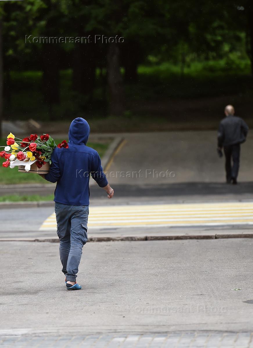 Жанровая фотография. Мужчина несет тюльпаны.