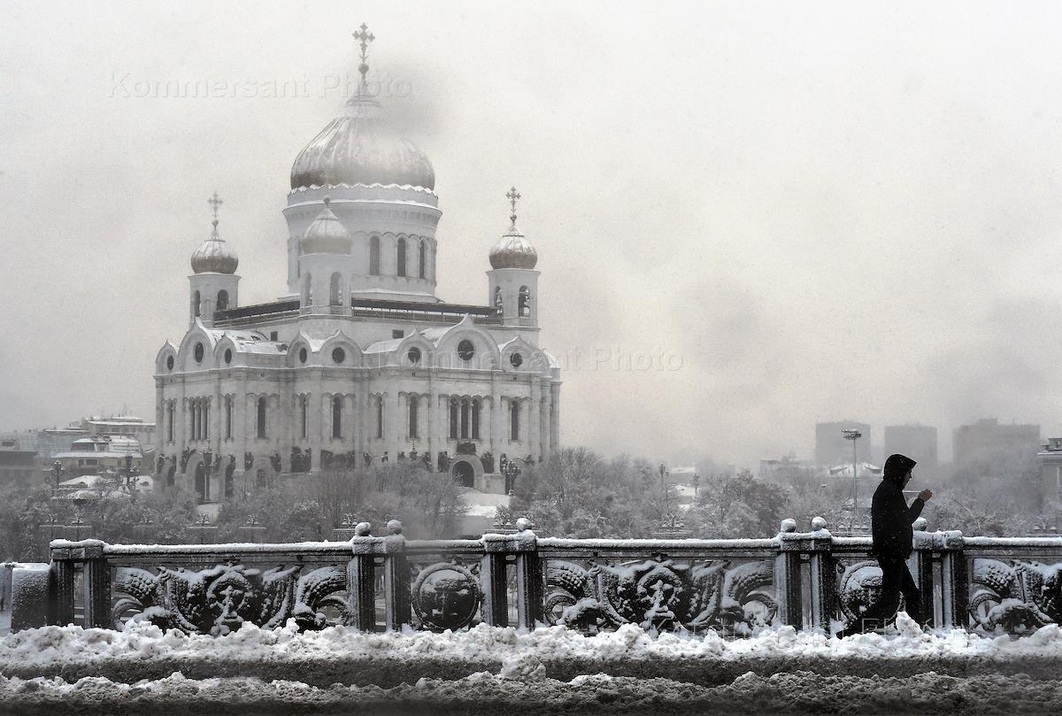 Жанровая фотография. Снегопад в городе. Храм Христа Спасителя и Большой Каменный мост в снегу.