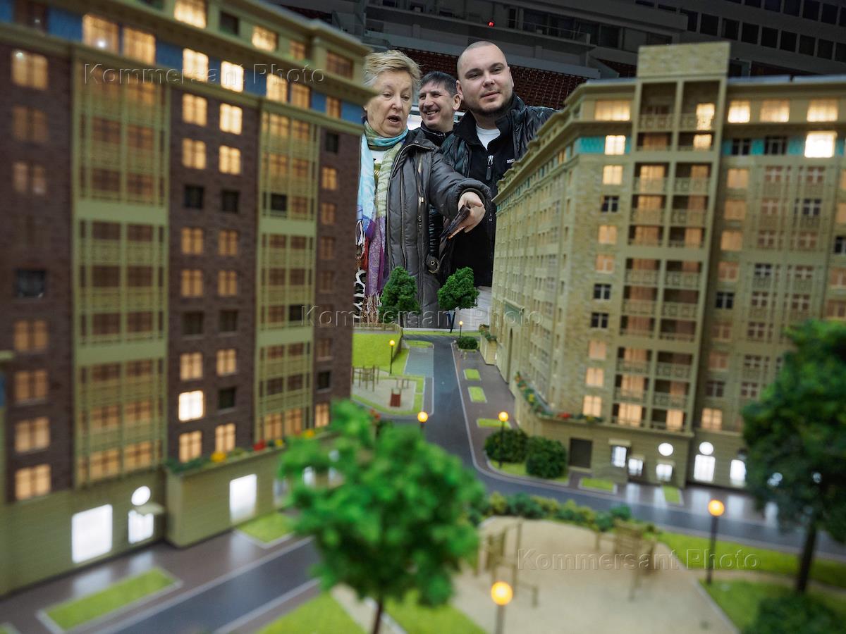 Выставка "Жилищный проект". Посетители выставки у макетов многоэтажных жилых домов.