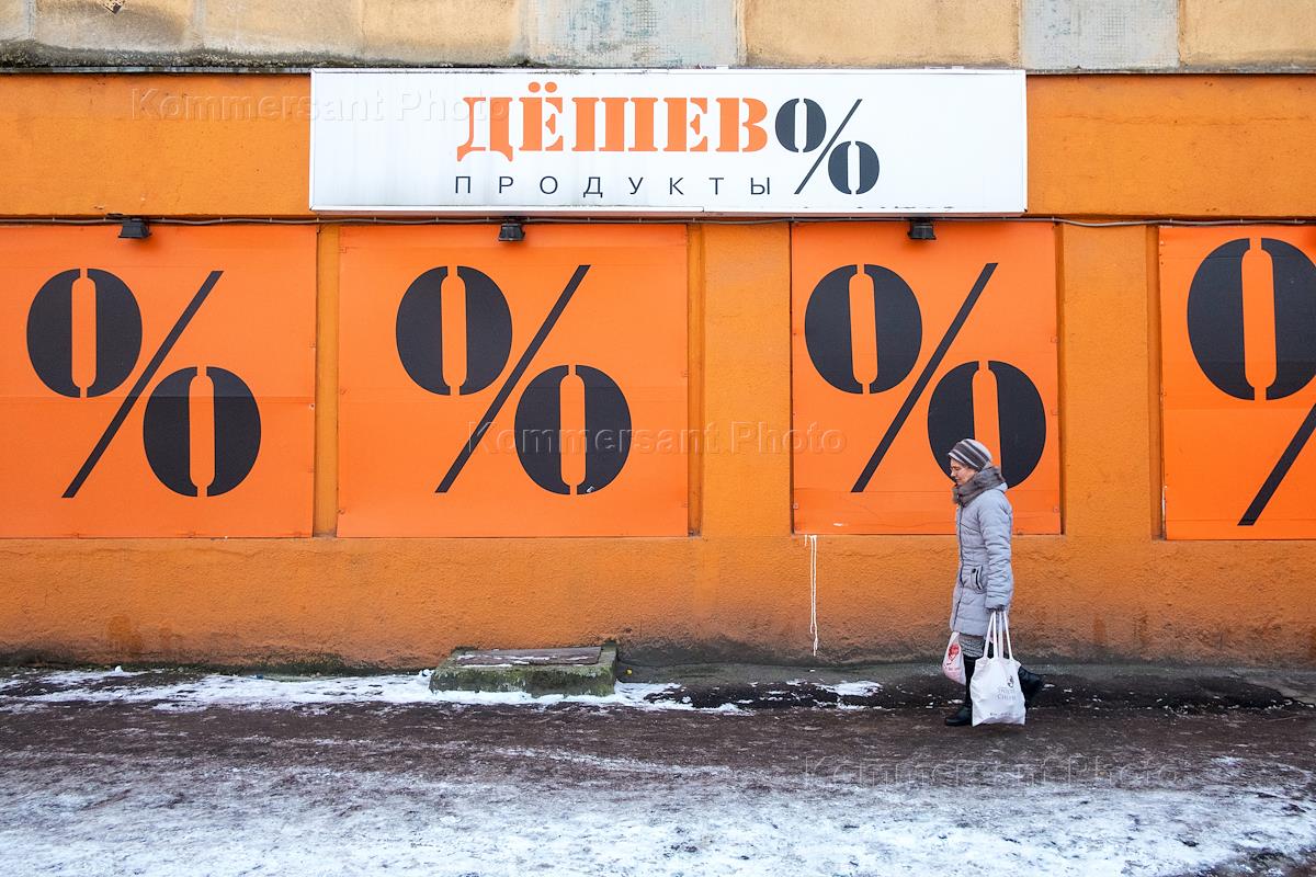 Жанровая фотография. Женщина с покупаками в сумках идет вдоль забора с рекламой дешевых продуктов.